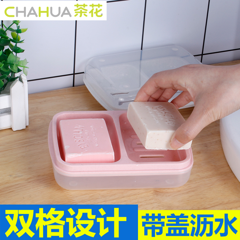 茶花肥皂盒双格皂盒创意便携带盖学生宿舍家用大号双层沥水香皂盒