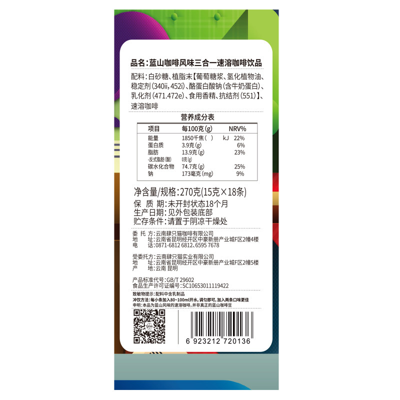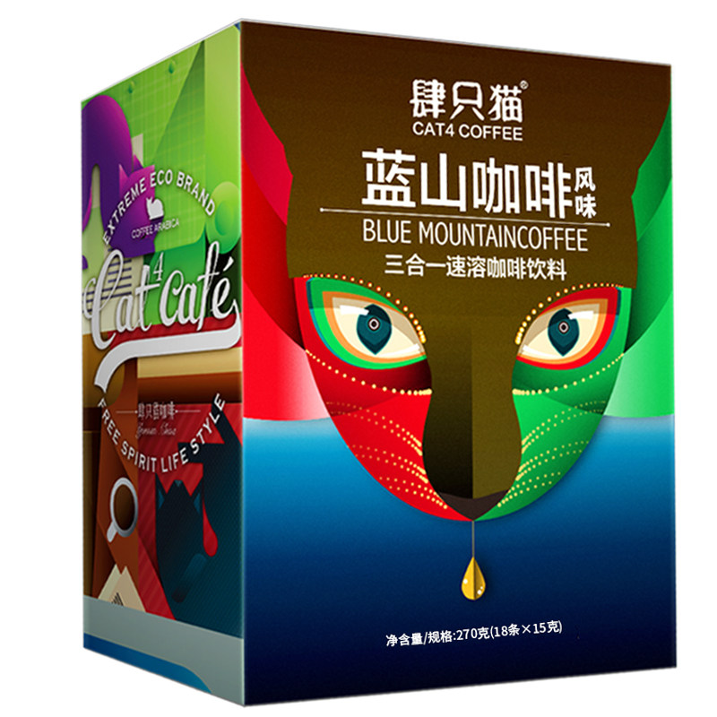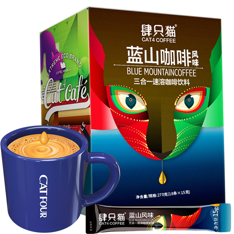 肆四只猫蓝山风味速溶咖啡云南小粒三合一速溶咖啡粉饮料18条/盒