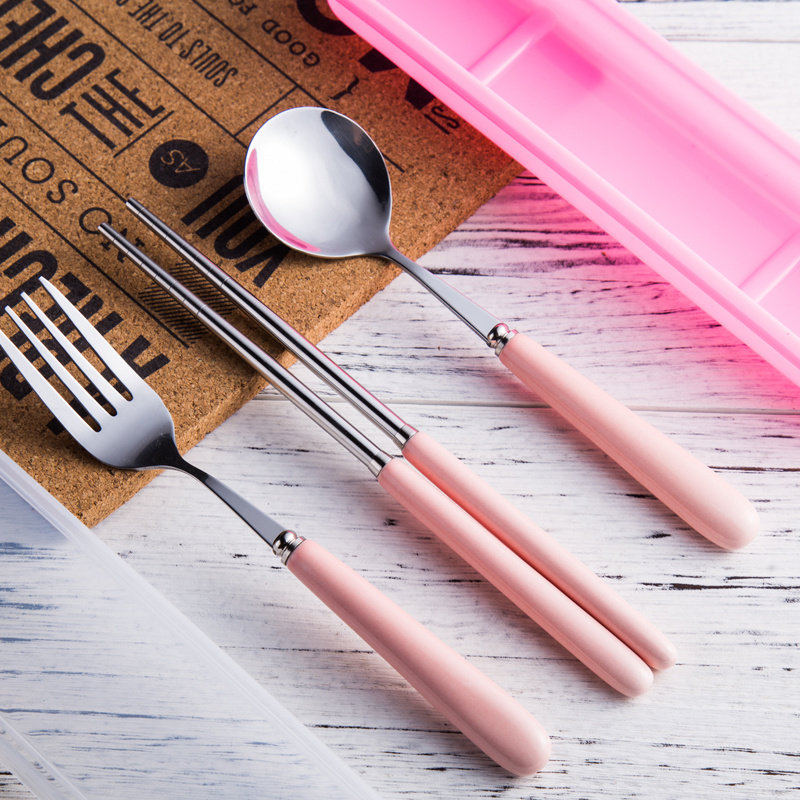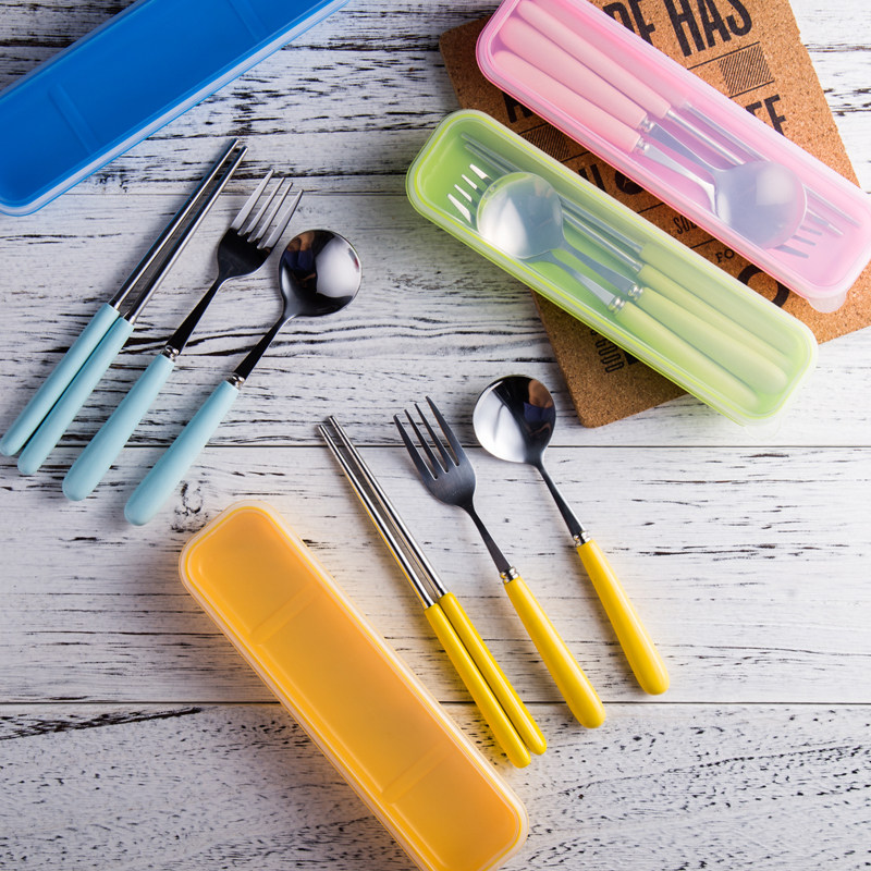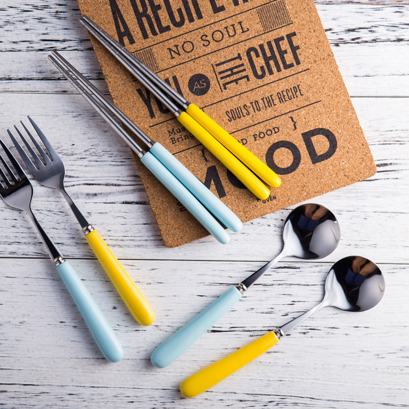 马卡龙彩色陶瓷不锈钢勺子筷子叉子学生旅游便携式餐具三件套装