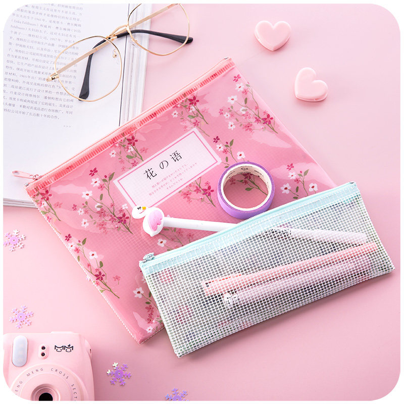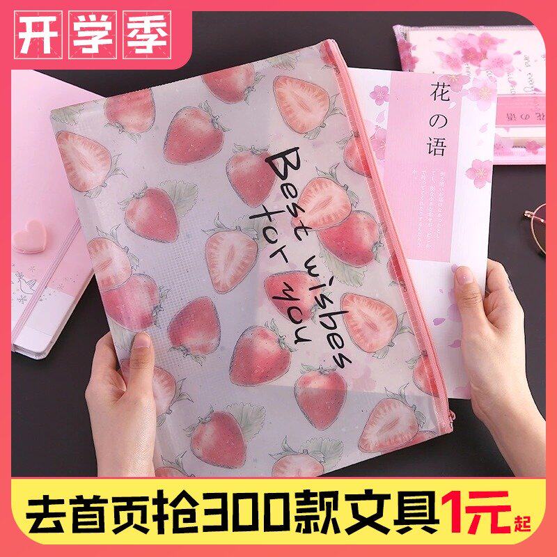 可爱透明拉链文件袋简约网格女学生用A4试卷资料夹收纳袋包大容量