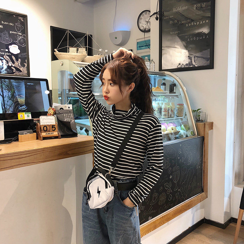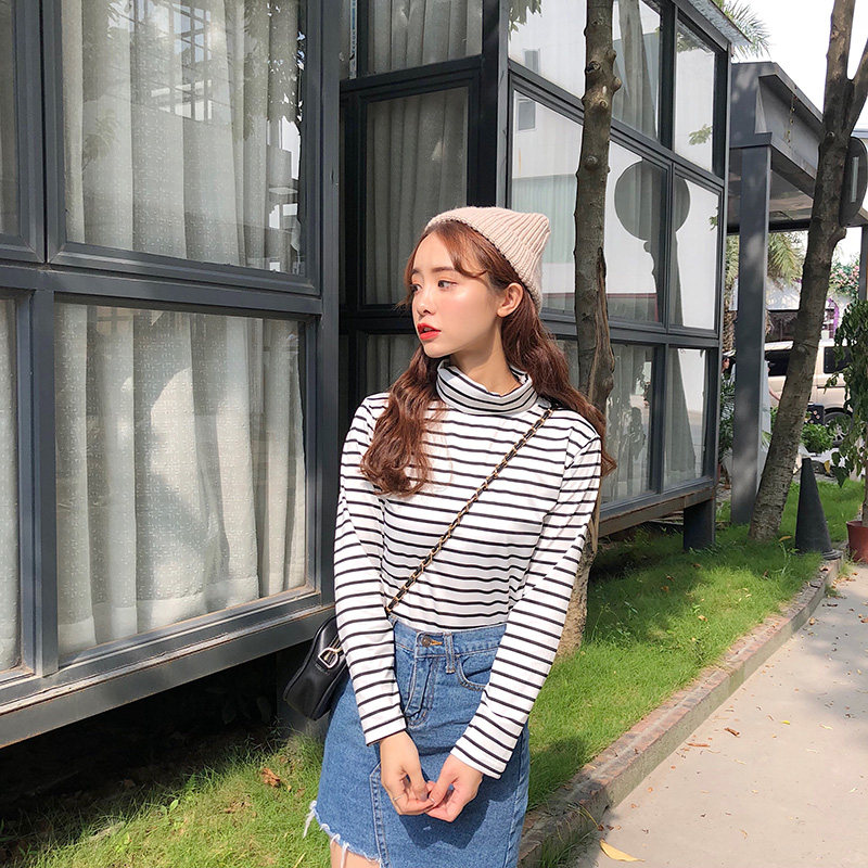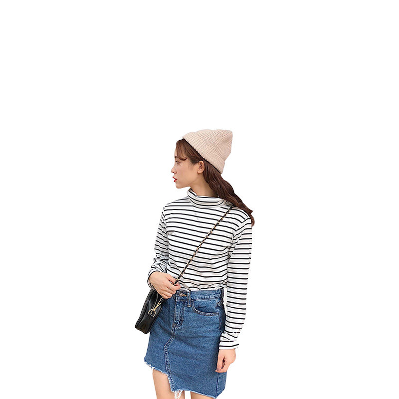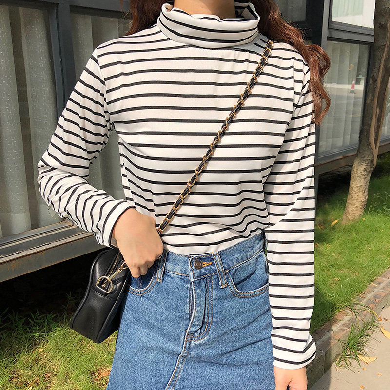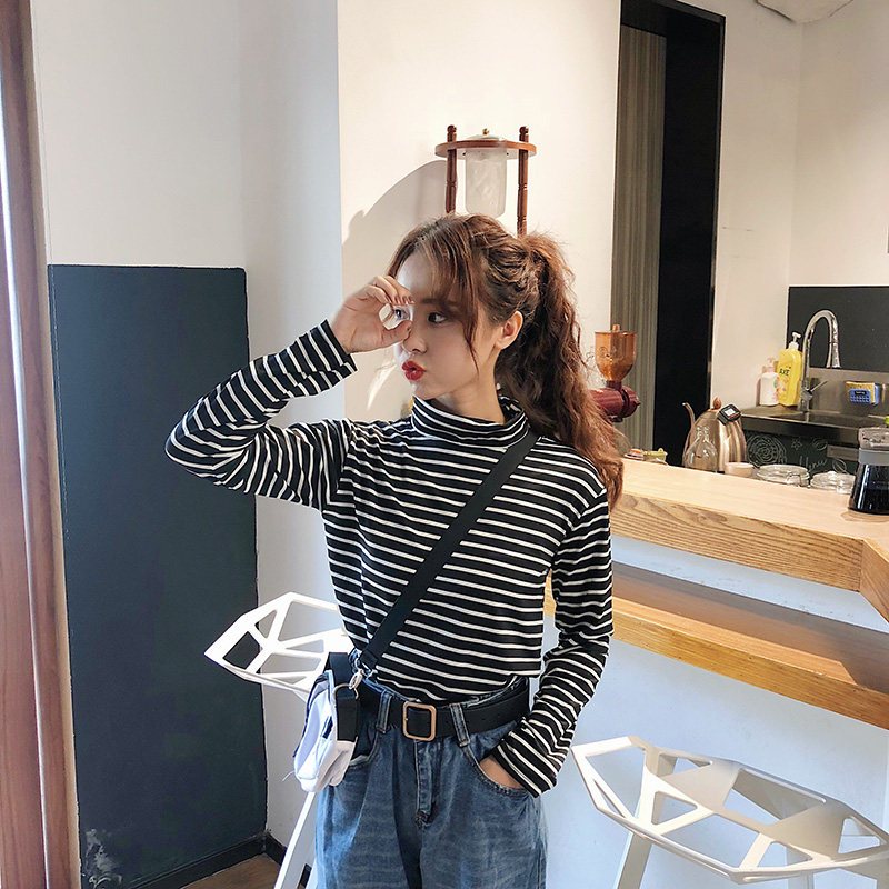 长袖T恤女条纹高领打底衫 韩版女装2020春秋装百搭内搭上衣潮
