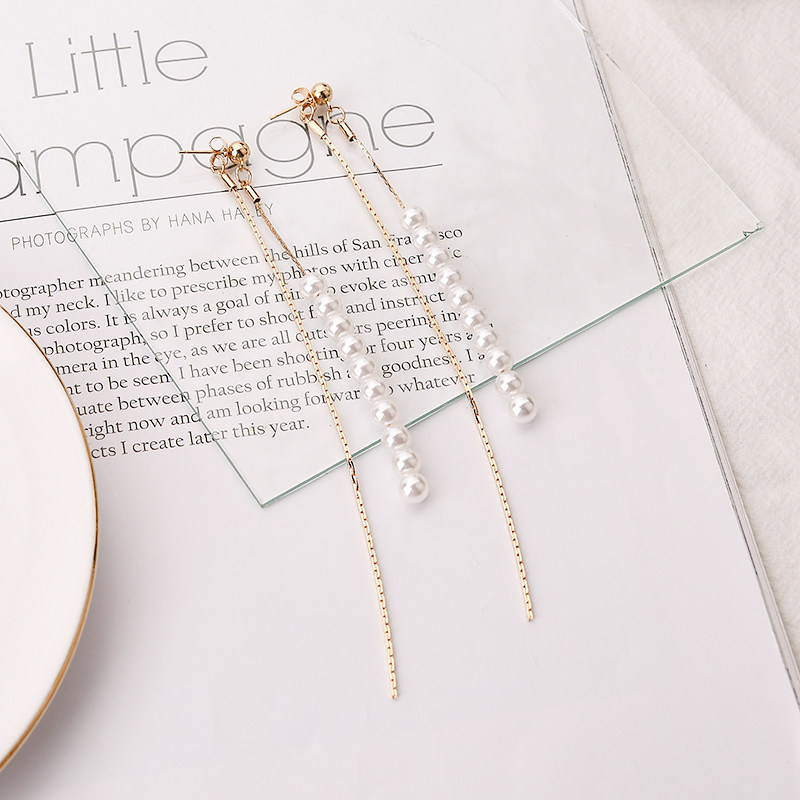 纯姿新款网红耳环女气质韩国简约长款珍珠流苏银针水滴耳线耳饰品
