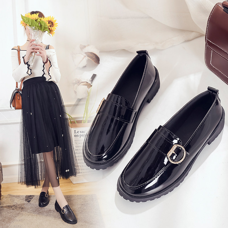 单鞋女2019新款百搭粗跟平底鞋方扣小皮鞋女英伦休闲漆皮亮光鞋潮