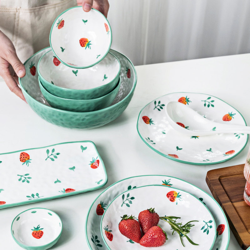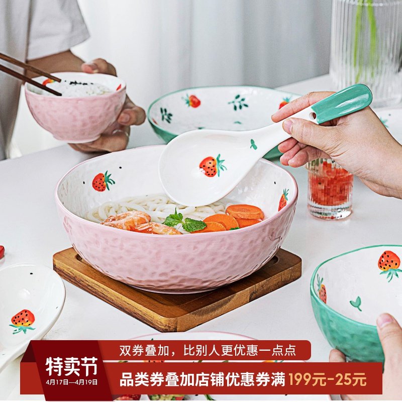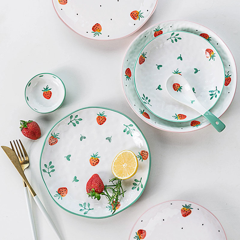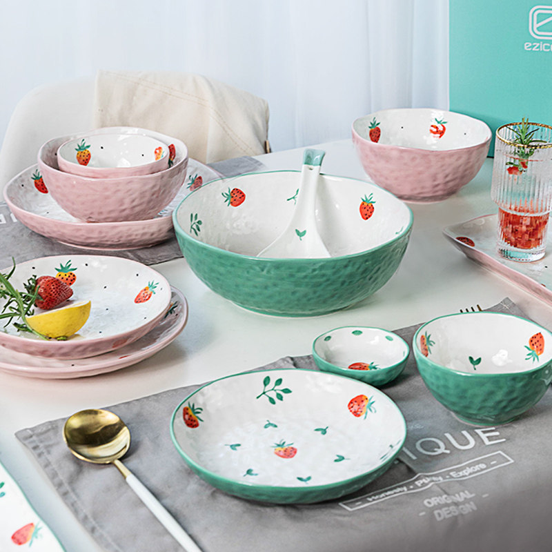 ezicok 可爱草莓餐具碗碟套装家用创意日式ins碗菜盘早餐网红盘子