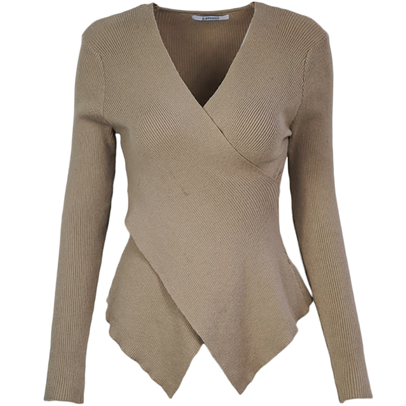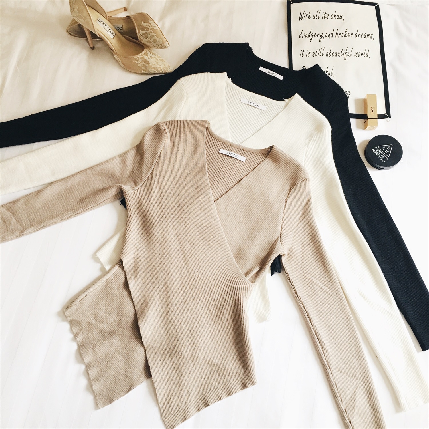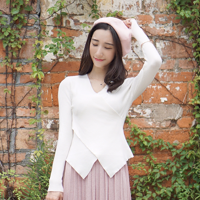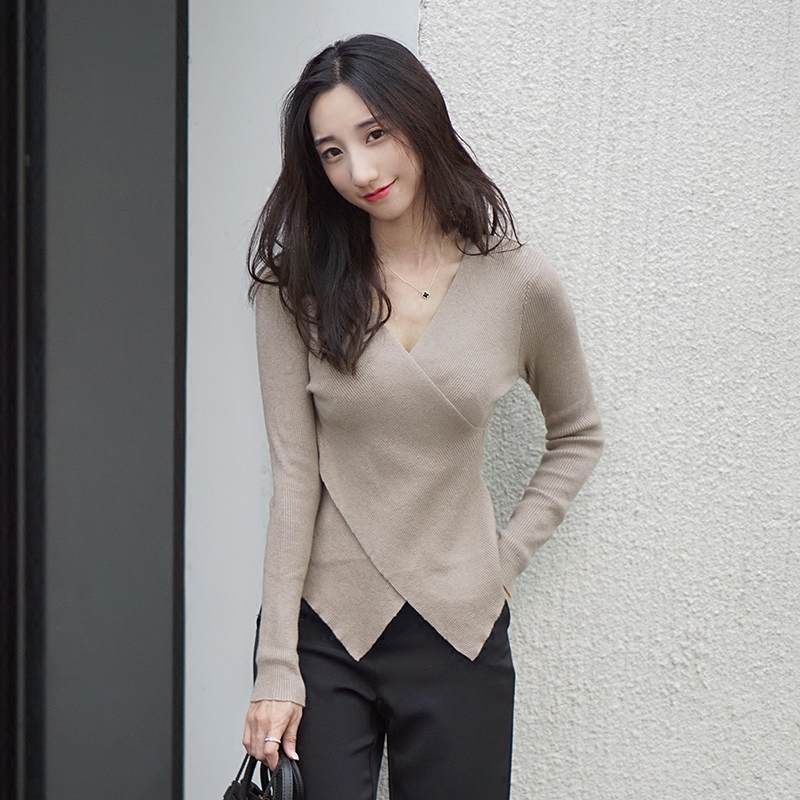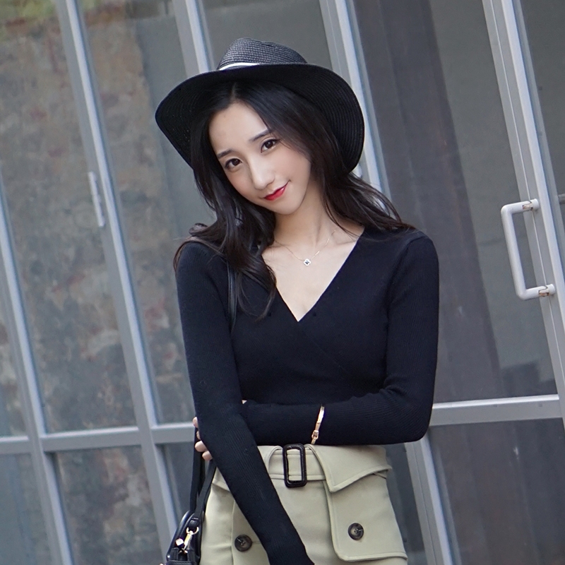 张大宝 2019秋女装弹力修身套头V领不规则交叉短款针织衫长袖打底