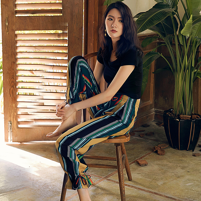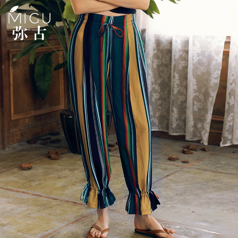 弥古条纹高腰束脚阔腿裤女夏哈伦裤灯笼裤海边度假休闲沙滩裤长裤