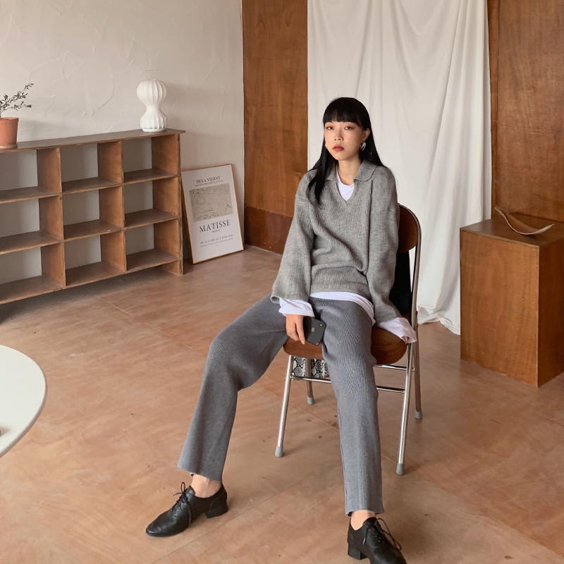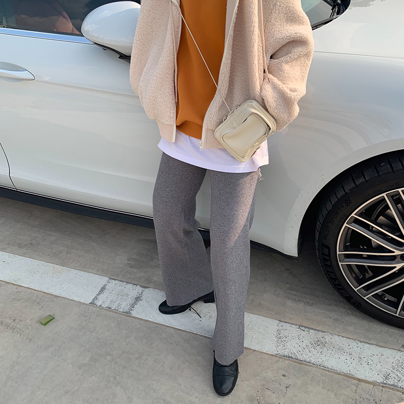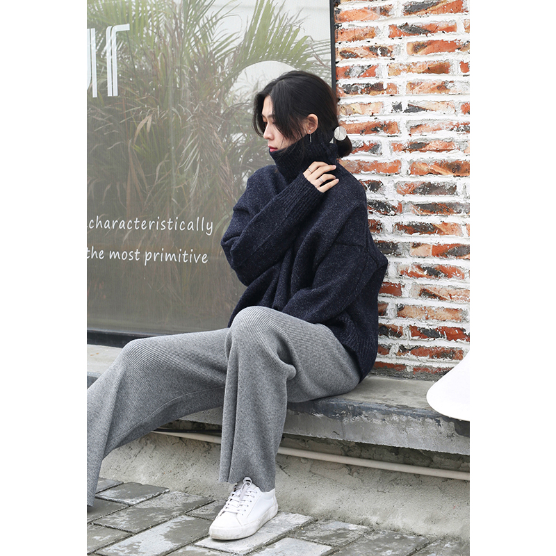 CBOMB 针织垂坠感阔腿长裤女2019春新款宽松休闲高腰直筒九分裤