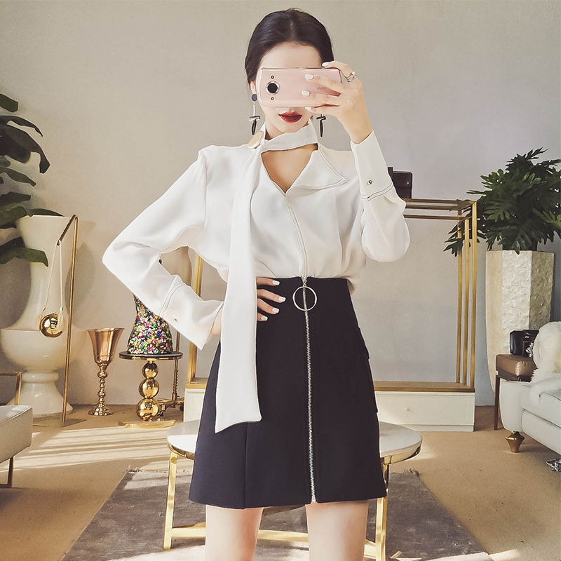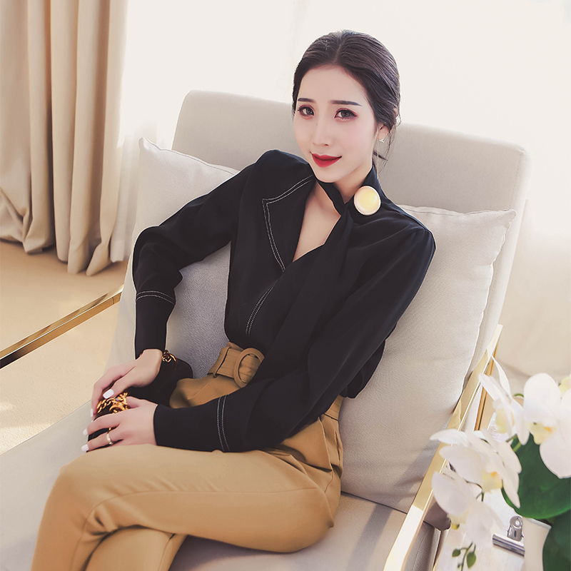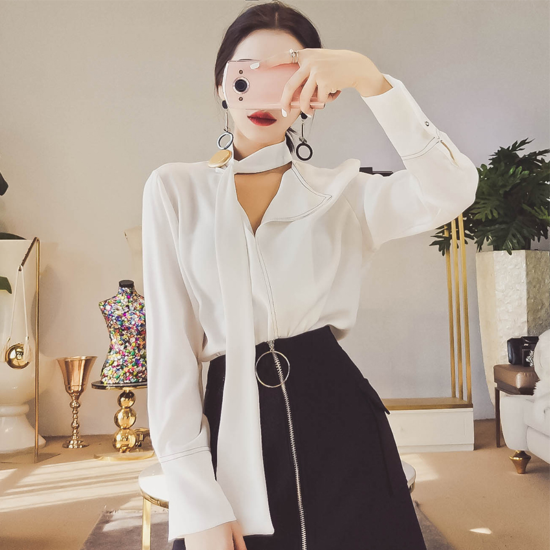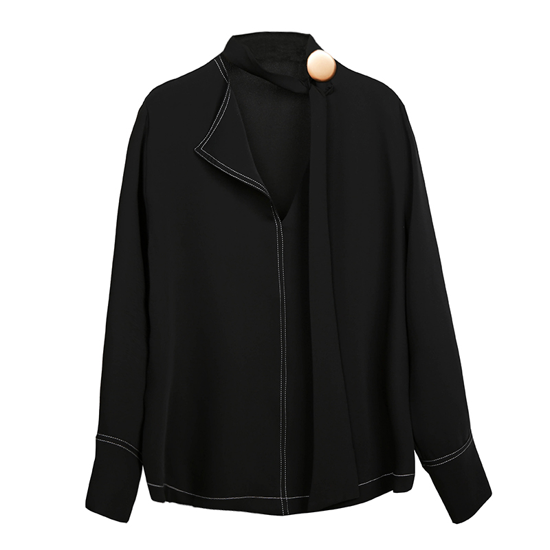 MISS FLY2019秋装新款女装韩版宽松不规则套头蝴蝶结衬衫长袖上衣
