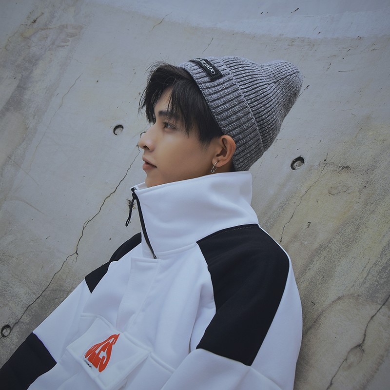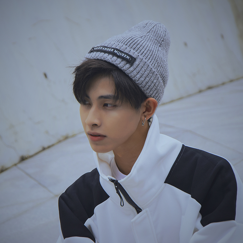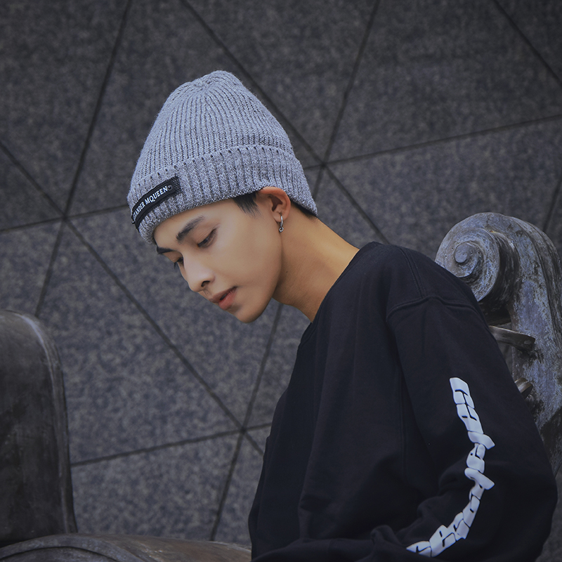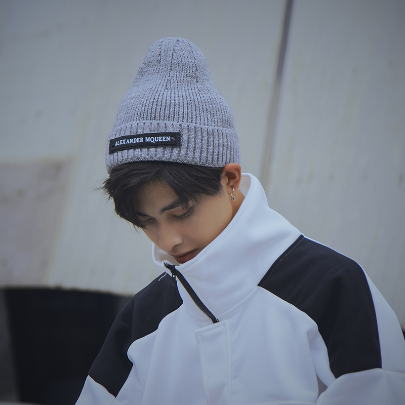 加绒毛线帽男潮韩版时尚百搭秋冬保暖针织冷帽贴布青年冬季帽子男